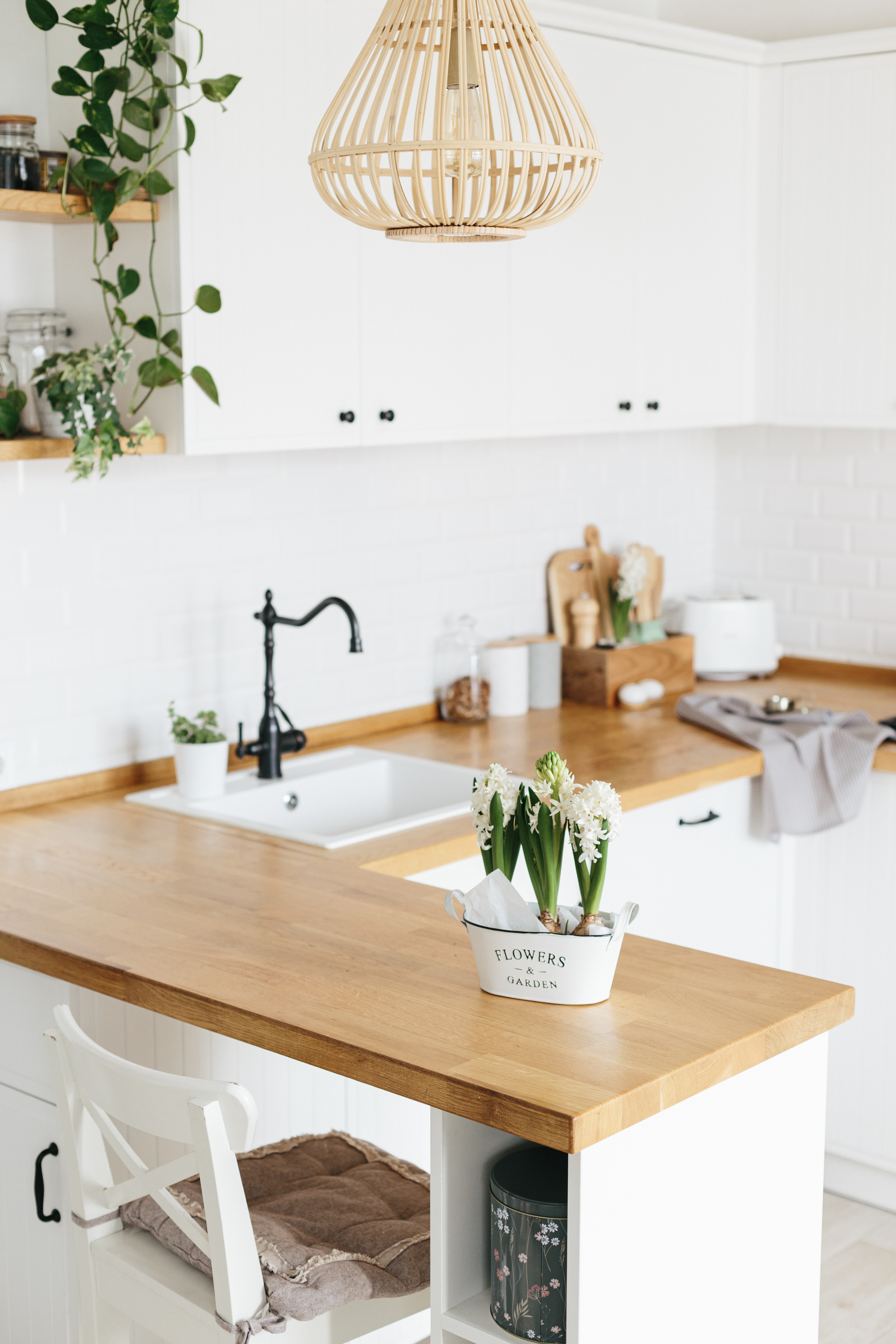 Ważną rolę odgrywa również oświetlenie. Przy rustykalnym wystroju dobrze jest zadbać o dodatkowe źródła światła. Szykowny żyrandol albo lampa wisząca zapewnią funkcjonalność, natomiast kinkiety albo oprawy wpuszczane nadadzą wnętrzu przyjemnego klimatu. Biała kuchnia z drewnianym blatem prezentuje się całkiem inaczej w zależności od koloru drewna. Ciemne odcienie pasują do stylu rustykalnego, z kolei szarości i jasny brąz świetnie sprawdzą się przy skandynawskim wystroju. W drugim przypadku warto też zadbać o podłogę w podobnej tonacji. W ten sposób uzyskasz spójny efekt.