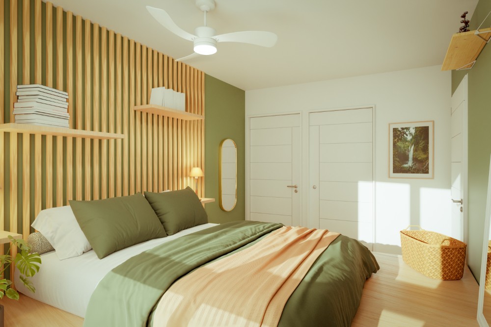 Styl japandi – to bardzo modne połączenie stylu skandynawskiego i japońskiego. Estetyka spaja w sobie fascynację światem natury z minimalizmem. W sypialni japandi dominują odcienie ziemi. Idealnie sprawdzają się więc różnego rodzaju brązy, beże i zielenie. W kwestii zielonych akcentów dobrze spiszą się m.in. delikatne ściany, tekstylne dodatki, ale też żywe rośliny.